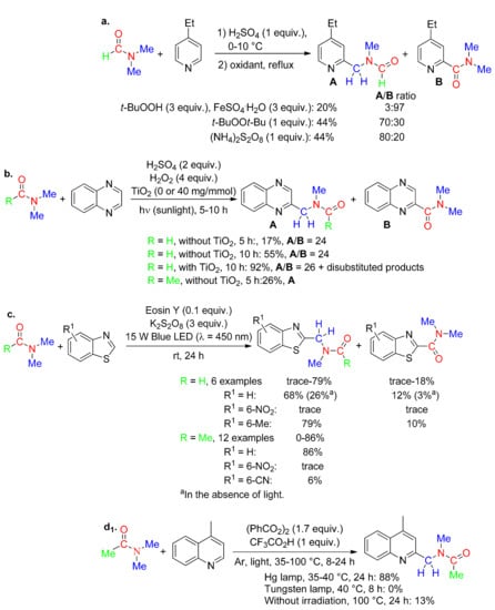 - Okugawa, N.; Moriyama, K.; Togo, H. Introduction of quinolines and isoquinolines onto nonactivated α-C−H bond of tertiary amides through a radical pathway. J. Org. Chem. 2017, 82, 170–178. [Google Scholar] [CrossRef]