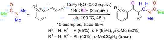 - Yan, H.; Lu, L.; Rong, G.; Liu, D.; Zheng, Y.; Chen, J.; Mao, J. Functionalization of amides via copper-catalyzed oxyalkylation of vinylarenes and decarboxylative alkenylation of sp3 C-H. J. Org. Chem. 2014, 79, 7103–7111. [Google Scholar] [CrossRef]