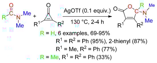 - Matsuda, T.; Tabata, Y.; Suzuki, H. Silver-catalyzed ring-opening [3+2] annulation of cyclopropenones with amides. New J. Chem. 2018, 42, 19178–19182. [Google Scholar] [CrossRef]
