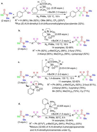 - Jang, Y.K.; Krückel, T.; Rueping, M.; El-Sepelgy, O. Sustainable alkylation of unactivated esters and amides with alcohols enabled by manganese catalysis. Org. Lett. 2018, 20, 7779–7783. [Google Scholar] [CrossRef] [PubMed]
