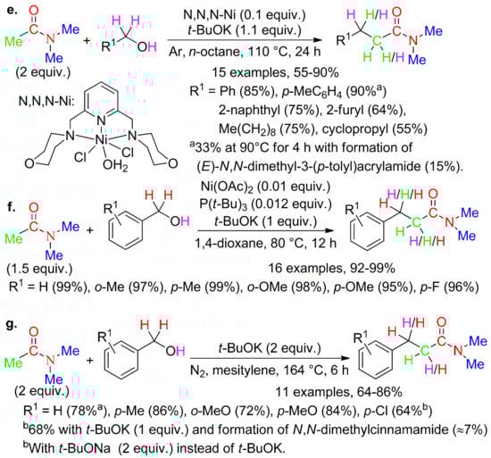 - Yang, P.; Wang, X.; Ma, Y.; Sun, Y.; Zhang, L.; Yue, J.; Fu, K.; Zhou, J.S.; Tang, B. Nickel-catalyzed C-alkylation of thioamide, amides and esters by primary alcohols through a hydrogen autotransfer strategy. Chem. Commun. 2020, 56, 14083–14086. [Google Scholar] [CrossRef] [PubMed]
