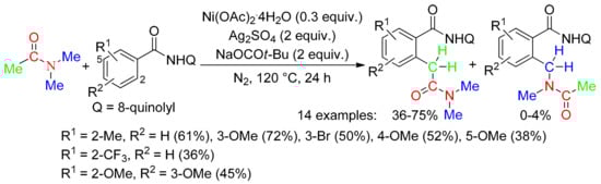 - Lv, N.; Yu, S.; Hong, C.; Han, D.-M.; Zhang, Y. Selectively oxidative C(sp2)−H/C(sp3)−H cross-coupling of benzamides with amides by nickel catalysis. Org. Lett. 2020, 22, 9308–9312. [Google Scholar] [CrossRef]