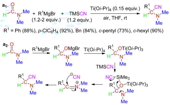 - Yu, B.; Bodinier, F.; Saague-Tenefo, M.; Gerardo, P.; Ardisson, J.; Lannou, M.I.; Sorin, G. One-pot synthesis of α-amino nitrile units through alkylative Strecker cyanation from formamides. Eur. J. Org. Chem. 2021, 3634–3640. [Google Scholar] [CrossRef]