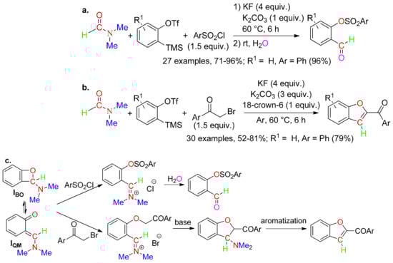 - Sharma, A.; Gogoi, P. 2-Formylarylsulfonate from aryne: A sequential reaction strategy for direct synthesis of ortho-hydroxyl-protected aryl aldehydes. ChemistrySelect 2017, 2, 11801–11805. [Google Scholar] [CrossRef]