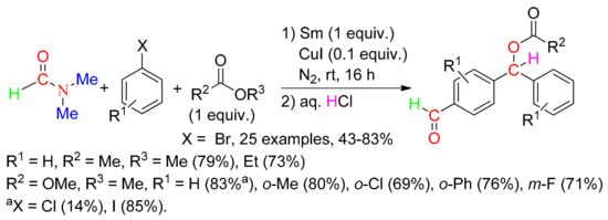 - Song, B.; Zhang, D.; Xiao, S.; Liu, C.; Chen, H.; Qi, Y.; Liu, Y. Access to diarylmethanol skeletons via a samarium/copper-mediated sequential three-component C−H functionalization reaction. J. Org. Chem. 2021, 86, 9854–9860. [Google Scholar] [CrossRef]