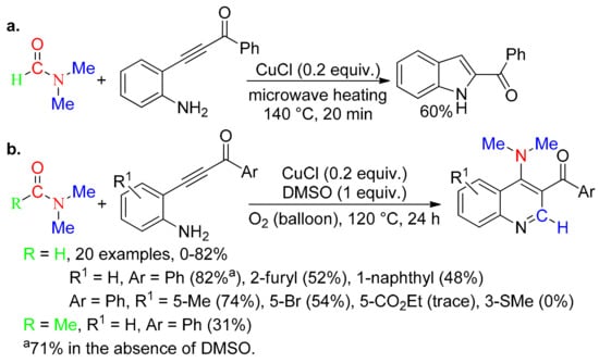 N,N-Dimethylquinolineamines have also been obtained from β-(2-aminophenyl)-α,β-ynones, DMF, and aqueous sodium hydroxide (Scheme 12b) [45].