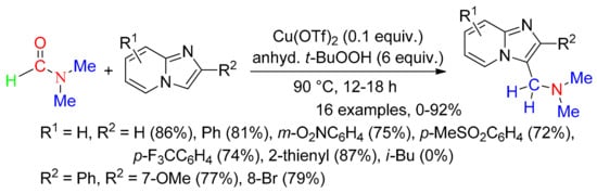- Ghosh, P.; Samanta, S.; Ghosh, S.; Jana, S.; Hajra, A. Aminomethylation of imidazopyridines using N,N-dimethylformamide as an aminomethylating reagent under Cu(II)-catalysis. Tetrahedron Lett. 2020, 61, 152581. [Google Scholar] [CrossRef]