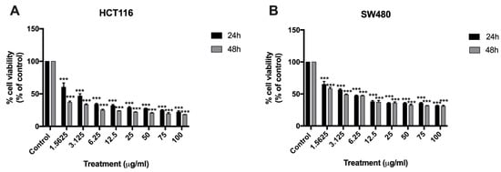 MTT assay showing the cytotoxic effect of BA at 24 and 48 h against HCT116 (A) and SW480 (B) colorectal cancer cells at BA concentrations ranging from 1.5625 to 100 ug/mL. Results are presented as mean ± standard error of the mean (SEM). Experiments were carried out in triplicate. One-way ANOVA and with Dunnett’s post hoc test were used to test statistical significance with *** indicating p < 0.001 vs. control group.