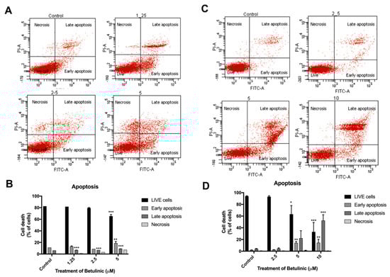 To study the BA-mediated cell death of HCT116 and SW480 cells, flow cytometry analysis was performed using Annexin V-FITC/PI double staining assay (Figure 5). The percentage of apoptotic cells was significantly increased in HCT116 cells after 24 h treatment with BA. Early apoptotic cells were increased to 12.9, 8.6 and 18.6%; and late apoptotic cells increased to 6.7, 6.8 and 9.05%, at 1.25, 2.5 and 5 µM, respectively. (Figure 5A,B). Likewise, in SW480 cells the percentages of the early apoptotic was increased to 2.25, 14.1 and 14.3% of cells in early apoptosis; and to 4.25, 22.0 and 52.3% of cells in late apoptosis at 0, 2.5, 5 and 10 µM, respectively, after 24 h treatment with BA compared to the untreated cells. (Figure 5C,D). These results indicated that the inhibitory effect of BA on human colorectal cancer cells, HCT116 and SW480, were due to the induction of apoptosis.