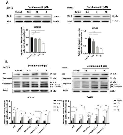 Western blot analysis showing the expression of anti-apoptotic (A) and proapoptotic proteins (B) in HCT116 and SW480 colorectal cancer cells at 24 h following the BA treatment. Actin was used as the internal control. Experiments were carried out in triplicate. Results are represented as mean ± standard error of the mean (SEM). One-way ANOVA and with Dunnett’s post hoc test were used to test statistical significance with * indicating p < 0.05, ** p < 0.01 and *** p < 0.001 vs. control group.