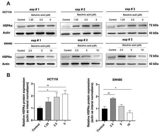 Western blot analysis showing the HSPA’s expressions following the BA treatment in HCT116 and SW480 cell lines (A) and their corresponding quantifications (B). Actin was used as the internal control. All experiments were triplicate and the results were represented as mean ± standard error of the mean (SEM). One-way ANOVA and with Dunnett’s post hoc test were used to test statistical significance with * indicating p < 0.05, and ** p < 0.01 vs. control group.