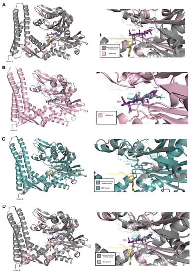 Comparison between the docking of BA and adenosine-derived inhibitor, (A) BA and ADP-bound structure, (B) adenosine-derived inhibitor and ADP-bound structure (C) as well as BA and adenosine-derived inhibitor and ADP-bound structure (D).