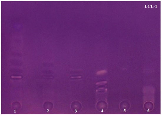 The AChE inhibiton assay used in the study was originally developed by Marston [38], but Mroczek [44] modified it to improve the sensitivity of the method. The use of 2-naphtyl acetate as the enzyme substrate proposed by Mroczek allowed one to obtain more concise and stable zones of inhibition on TLC plates. Scientists successfully applied this improved method in our laboratory to confirm the anti-AChE activity of alkaloid fractions obtained via VLC from Narcissus species [23]. Based on numerous literature data describing the potent AChE inhibitory activity present in the studied plant species of the Lycopodiaceae family, a rapid bioautographic method was used to screen and confirm the presence of the active compounds. In this method, 2-naphtyl acetate was added to the mobile phase composed of chloroform–methanol–25% aqueous ammonia solution at a ratio of 95:5:0.2 (v/v/v), developing TLC chromatograms. The substrate was converted into 2-naphtol by the enzyme and then a deep purple background of the TLC plates was obtained by reacting 2-naphtol with Fast Blue Salt solution. As a result, active AChE inhibitors were visible as colorless or yellowish zones on a purple background. The results are shown in Figure 2, Figure 3 and Figure 4. These analyses were performed in a modern and automated device, the Camag Derivatizer, which significantly exceeded the efficiency, speed and convenience of manual spraying. The reduction in the total analysis time allowed one to perform a series of bioautographic enzyme assays in a short time and compare the white zones of AChE inhibitors present in individual fractions obtained from each experiment.