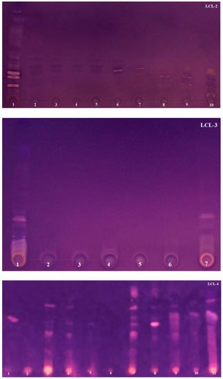 TLC chromatograms presenting L. clavatum fractions obtained from four experiments after acetylcholinesterase assays. LCL-1 shows 6 fractions obtained from the first experiment via VLC using Al2O3 and silica gel in ratio 1:3 as sorbents; LCL-2 shows 10 fractions obtained from the second experiment via VLC using Al2O3 and silica gel in ratio 3:1 as sorbents; LCL-3 shows 7 fractions obtained from the third experiment via VLC using silanized silica gel as a sorbent; LCL-4 shows 11 fractions obtained from the fourth experiment via VLC using silanized silica gel as a sorbent and using new reversed-phase system.