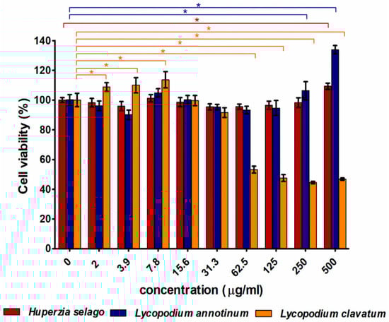 The satisfactory results of AChE activity obtained for the alkaloid fractions encouraged us to test the safety of extracts from these plant materials. Cytotoxicity tests revealed that H. selago and L. annotinum extracts were non-toxic to skin fibroblasts at the tested concentration range (2–500 μg/mL). Interestingly, the highest concentrations of mentioned extracts positively affected cell metabolism and fibroblast viability was significantly higher compared to the control cells (Figure 5). L. clavatum extract was non-toxic to skin fibroblasts at low concentrations (in the range of 2–31.3 μg/mL). Moreover, concentrations in the range of 2–7.8 µg/mL significantly increased cell viability compared to the control fibroblasts. Beginning from the concentration equal to 62.5 μg/mL, cell viability was significantly reduced to approximately 45–55% compared to the control cells.