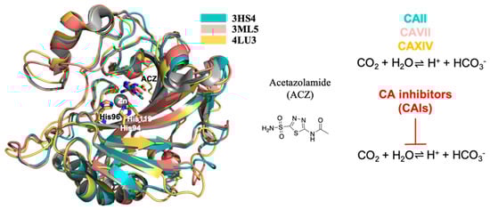 Superposition of human CAII, VII and XIV in complex with acetazolamide (ACZ). In the middle chemical structure of ACZ, on the right CAs activity and CAIs action. All the structural figures have been made with PyMol [12] modifying the scripts previously used [13,14] and the images were assembled using GNU Image Manipulation Program (GIMP) [15].