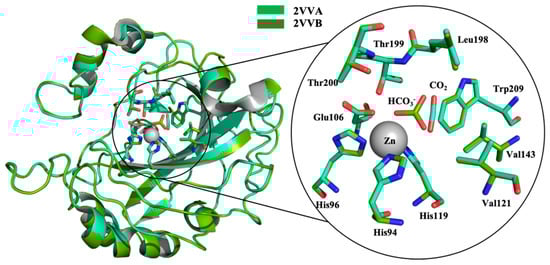 Recently, crystallographic studies have clarified how the two key substrates, CO2 and HCO3−, bind the CA’s active site. In particular, the crystal structure of α-CA II (pdb 2VVA) displays that CO2 is located in the hydrophobic pocket (around Val121, Val143, Trp209 and Leu198) and it does not directly bind the Zn2+ ion, while the HCO3− specie coordinates metal ion (pdb 2VVB) [27] (Figure 2).