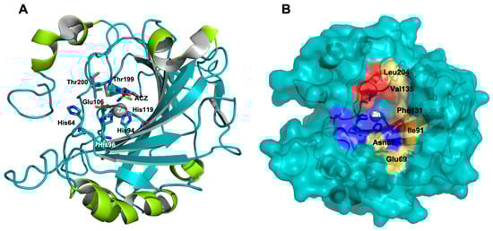 CA II, as well as all other CAs, has the canonical three-dimensional ellipsoidal fold [30] (Figure 3A). The active site is characterized by a Zn2+ ion, fundamental for catalysis, placed at the bottom of the canonic cleft that is composed of a hydrophobic and a hydrophilic pocket (Figure 3B) [25].