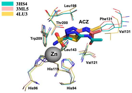 The superposition among the crystal structures of CA II, VII and XIV in complex with ACZ show that ACZ binds all these isozymes in a similar mode. The sulfonamide amine N atom of ACZ binds directly to the Zn2+ ion, together with the side chains of His94, His96 and His119, in the catalytic cleft (Figure 5) [27,33,38]. In general, this ligand orientation, in the catalytic site, is observed for the sulfonamide CAI base inhibitors.