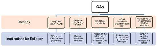 - CAs regulate CO2 tissue concentration, and it has been demonstrated that CO2 has a role in epilepsy. In particular, clinical evidence suggest that the enhancement of CO2 concentration results in better seizure control [50], while low CO2 levels are linked to higher seizure propensity [51]. The inhibition of CAs resulted in increased CO2 concentration and a positive outcome in epilepsy management [9].