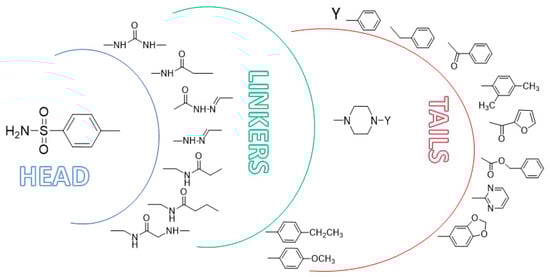 In detail, the head is characterized by benzensulfonamide portion, the linkers are of several types such as carboxamide, urea, acid hydrazide and amide, etc. Finally, the best tails consist of phenyl para substituted group or N-substituted piperazine moiety. The latter is functionalized on a nitrogen atom with various Y groups, as reported in Figure 10.