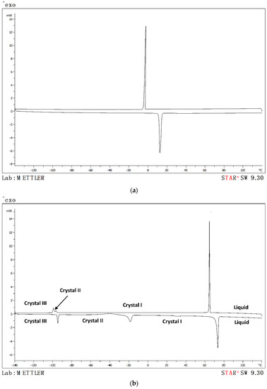 For the thermal analyses, 40 μL aluminum pans hermetically sealed with a pinhole at the top were used for the samples and a similar empty pan (also with a pinhole) was used as a reference in the furnace. The masses of the samples were between 4 and 8 mg. All the samples were weighed using a Mettler-Toledo AX-205 Delta Range balance with an uncertainty in the measurement of ±3 × 10−4. The calibration for temperature and heat flow was performed using the following pure substances: zinc, indium, water, and heptane. The tau lag calibration was carried out at the −20, −15, −10, 2,5, 10, and 20 K·min−1 rates. The standard uncertainty of the measurement of the temperature in the thermal analysis was ±1 K.