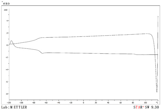 The determination of transition temperatures was performed according to the following procedure: the samples of pure ionic liquids or their equimolar mixtures were cooled from to 393.15 K to 133.15 K with a relatively slow heating rate of 2 K·min−1 and, afterwards, they were heated from 133.15 K to 393.15 K at the same rate. Therefore, before performing the thermal analysis, the ionic liquids were dried inside the DSC by heating at T = 393.15 K for 30 min.