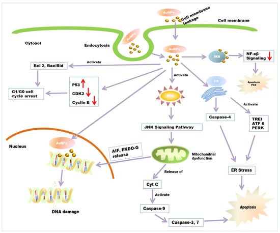 Anticancer mechanism of AuNPs. Entry of AuNPs into the cell’s endocytosis or cellular internalization through a lipid bilayer. AuNPs induce the apoptosis of cancerous cells through ROS-mediated mitochondrial dysfunction and caspase activation. AuNPs causes ER stress through the activation of caspase 4 and stress-related proteins, which also results in apoptosis. Damaged mitochondria release AIF, ENDO-G into the nucleus, which causes the final execution of cell death. AuNPs increases the expression of P53 and decreases the expression of CDK2, Cyclin E. It also elevates the expression of apoptotic gene bid, bax/bcl2, which ultimately leads to G0/G1 phase cell-cycle arrest. AuNP induces PCD and apoptosis through the interfering NF-κB signalling pathway.