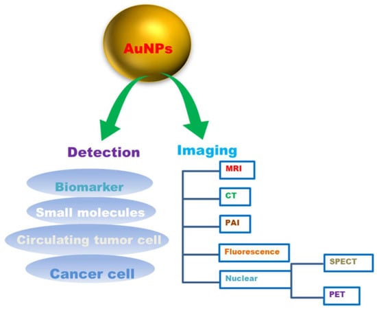 AuNPs are being utilized as promising tools for real-time, convenient, and cost-effective cancer diagnosis and detection [237]. The main constraint of various in vitro diagnostic systems is their average detection sensitivity. For example, prostate cancer biomarker detection with enzyme-linked immunosorbent assay (ELISA) can detect a threshold limit of about 0.1 ng/mL, which is normally higher than the concentrations of a cancer biomarker in most serum samples. AuNPs, tend to have high sensitivity for the detection of biomarkers [238]. Their unique physical and optical properties, viz., localized surface plasmon resonance (LSPR), fluorescence resonance energy transfer (FRET), surface-enhanced Raman scattering (SERS), nonlinear optical properties, and quantized charging effect. Enhance AuNPs to sense or detect various targets [238]. AuNPs can help in vitro detection of biomolecules and be used as a diagnostic agent for cancer diagnosis by conjugation with biomarkers viz., oligonucleotides or antibodies to detect the target components [236]. It was reported that it was possible to identify and track the primary glioma cells using mercaptoundecanoic acid-coated AuNPs in mouse brains [239]. Gold nanoparticles (AuNPs) were also reported to be capable of diagnosing with CTC detection. It has been demonstrated that AuNPs can boost the sensitivity and the specificity of CTC detection appliances, and have the ability to aid in cancer diagnosis as well as prognosis [3]. Various imaging technologies, such as computed tomography, ultrasound and magnetic resonance, can provide precise information about disease diagnosis and therapy. AuNPs with unique tuneable chemical and physical properties could thus be an ideal contrast agent for imaging. The use of gold nanoparticles as contrast agents for imaging diagnosis is suitable for various imaging techniques ranging from magnetic resonance imaging (MRI), computed tomography (CT), nuclear imaging, fluorescence imaging, photoacoustic imaging (PAI) to various other imaging techniques (Table 4).