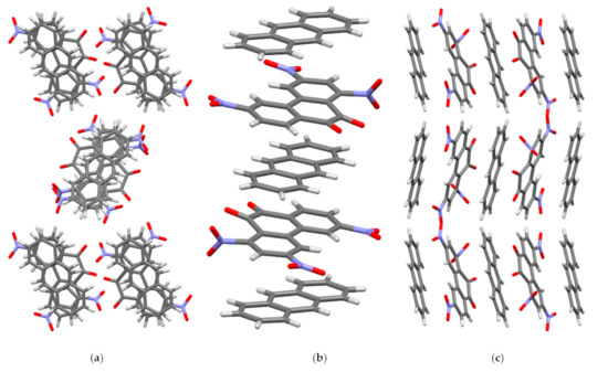 In crystal I, the molecules of the acceptor PQ and the donor AN are arranged parallel to each other and form stacks of mixed type {⋅⋅⋅[A-D]⋅⋅⋅[A-D]’⋅⋅⋅}∞ along the crystallographic axis a (Figure 4). Every second PQ molecule in the stack is rotated in a plane by 180° relative to the previous one (A and A’), which was observed for TNPQ molecules in II [11]. The AN molecules in I are displaced relative to each other (D and D’) only slightly and their central ring practically overlaps, which distinguishes them significantly from II, where the AN molecules are rotated by 60° relative to each other [11]. As a result of this mutual arrangement of the molecules PQ and AN in I, peculiar triads [D-A]⋅⋅⋅[D-]’ and [D-A]’⋅⋅⋅[D-] are formed, in which the π systems of the donor and the acceptor overlap almost to the same degree (Figure 4).