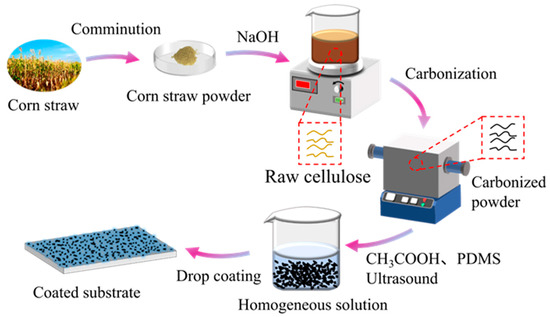 Corn straw was collected from a farm near the Yuzhong campus of Northwest Minzu University (Lanzhou, China); glass plates (25 mm × 25 mm), titanium plates (25 mm × 25 mm), and aluminum plates (25 mm × 25 mm) were supplied by Zhongnuo Advanced Material (Beijing, China) Technology Co., Ltd.; PDMS, Sylgard-184 with components of PDMS base and curing agent purchased from Dow Corning Company; sodium hydroxide was provided by Shuang Shuang Chemical Co. Ltd. (Yantai, China). All chemicals were used as received without further purification and deionized water (DI water) was used throughout all experiments.