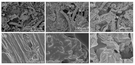 SEM images of CPs at carbonization temperature of (a,d) 400 ℃; (b,e) 600 ℃; (c,f) 800 ℃. (d–f) are enlarged images of (a–c), respectively.