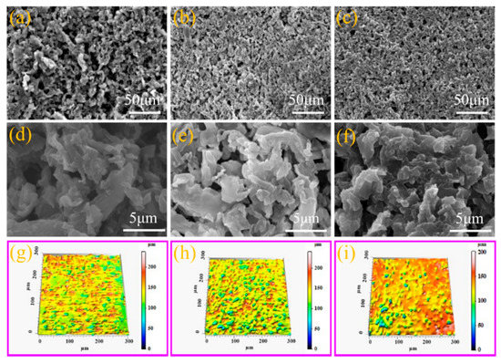 The surface morphologies (a–f) and 3D contour images (g–i) of the resulting coatings. (a,d,g) PDMS/CPs-400; (b,e,h) PDMS/CPs-600; (c,f,i) PDMS/CPs-800.
