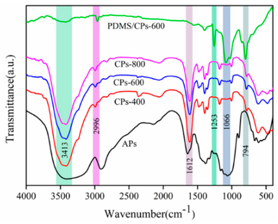 FT-IR spectra of APs, CPs-400, CPs-600, CPs-800 and PDMS/CPs-600.