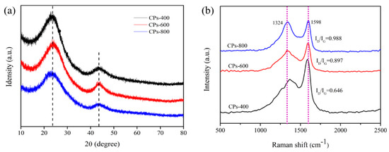 XRD pattern (a) and Raman spectra (b) of CPs-400, CPs-600, and CPs-800.