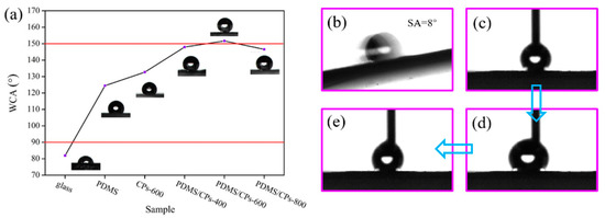 The water contact angle (WCA) test is important to determine the wettability of the as-prepared coatings. The results are shown in Figure 6a. During this process, the glass samples prepared from different coating solutions were taken as the test object. As can be seen in Figure 6a, the static water contact angles vary from 146.56 ± 2.14° to 151.67 ± 1.36° and the PDMS/CPs-600 coating exhibited the biggest contact angle value of 151.67 ± 1.36°, indicating its outstanding superhydrophobicity. Moreover, the WCA of PDMS/CPs-400 and PDMS/CPs-800 coatings were measured to be 147.96 ± 1.36° and 146.56 ± 2.14°, respectively, which shows good hydrophobicity of those two surfaces. All these results demonstrated that the performance of non-wettability increased with an increase in carbonization temperature, and the carbonization temperature of 600 °C formed the best hydrophobic property. In order to better understand the superhydrophobic performance of PDMS/CPs-600, the measurements of sliding angle (SA) and contact angle hysteresis were carried out at ambient temperature with a 2 μL water droplet, as shown in Figure 6b–e. The obtained SA value is 8° lower than 10°and hysteresis angle is 4.1 ± 2°, indicating an outstanding superhydrophobicity of PDMS/CPs-600 coating.