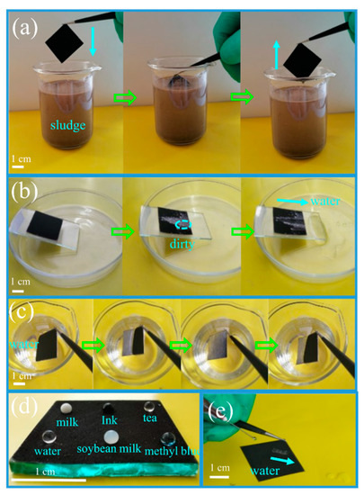 In order to demonstrate the self-cleaning properties of the superhydrophobic coatings, various self-cleaning tests were carried out on the surface of PDMS/CPs-600 under room temperature. In these experiments, sludge and white wall ash were treated as contaminants, meanwhile, the milk, ink, tea, and soybean milk were used as common household liquids. When the as-prepared coating material was taken out after soaking in the sludge, as expected, there were no visible contaminants on the superhydrophobic surface (Figure 8a, Supplementary Video S1), which might be caused by the small adhesion force of dirt on the coated surface [41]. However, the uncoated sample was contaminated obviously during a similar process—shown in Supplementary Video S1. Coated and uncoated substrates comparison showed an excellent antifouling property of the as-prepared coating. As shown in Figure 8b, the water was dropped on the superhydrophobic surface that was contaminated by white wall ash and the droplets rolled off rapidly with the dust without wetting the coated slide, illustrating an excellent dirt-removal property of the as-prepared coatings. Figure 8c shows that a silver mirror phenomenon on the superhydrophobic coating surface was observed when it was immersed in water, and then it floated on the surface of the water once it lost the external force, furthermore, the coated slide retained its non-wetting property after being moved out from the water. As shown in Figure 8d, different liquid droplets, simulated as real dirt conditions, are spherical in shape on the surface of the superhydrophobic coating, thus, the modified surfaces possess excellent antifouling performance. Besides that, Figure 8e shows an optical photograph of a jet of water bounced off and slipped off without any water spread out on the coated surface (also shown in Supplementary Video S2), conversely, the water droplets remain on the uncoated substrate and leave the surface in the form of water flow (Supplementary Video S2), indicating its outstanding waterproof ability. All these experimental results reveal that the corn straw carbon-based superhydrophobic surfaces modified with PDMS have great potential application in the fields of self-cleaning, anti-fouling, anti-corrosion, water collection, and anti-icing.