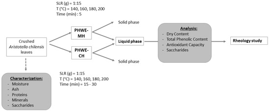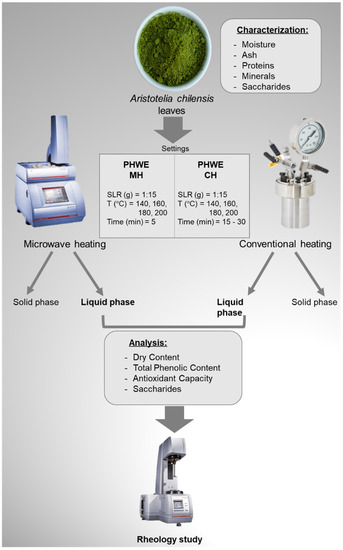 Pressurized hot water extractions with microwave heating (PHWE-MH) and conventional heating (PHWE-CH) were used to recover bioactive compounds from A. chilensis discarded leaves in a range of commonly used conditions for similar raw materials [9]. A schematic of the process and the subsequent analysis are summarized in Figure 1.