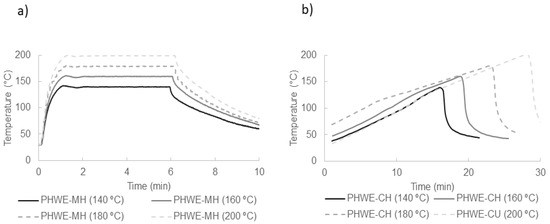 Figure 2 shows the heating and cooling profiles recorded during PHWE operation using microwave and conventional heating in the temperature range 140–200 °C. A different temperature evolution is evident. While the temperature rise takes about one minute in the PHWE-MH process, the temperature rise in PHWE-CH is linear and slow, taking between 15 and 30 min to reach the set temperature. To compare both heating methods better, we computed the severity, a combined factor of time and temperature. In Table 2, it can be seen that the severity values for PHWE-MH were in the range 1.36–2.56, while for PHWE-CH were in the range 1.52–3.48.