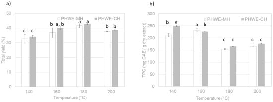 Influence of temperature on (a) soluble solids extraction yield (%) and (b) total phenolic content (mg GAE/g dry extract) during PHWE-MH and PHWE-CH of A. chilensis leaves. Letters above the graph bars indicate significantly different values (95% confidence, p < 0.05).