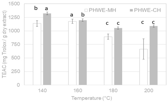 Antioxidant capacity of extracts influenced by temperature during PHWE-MH and PHWE-CH of A. chilensis leaves expressed as mg Trolox/g dry extract. Letters above the graph bars (i.e., a,b,c) indicate significantly different values (95% confidence, p < 0.05).