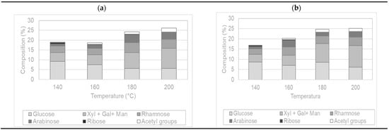 In both cases, glucose solubilization was favored at the lowest tested temperatures, reaching the highest content at 140 °C (around 9%), and then dropped when the temperature rose. This decrease in glucose content could be attributed to hydroxymethylfurfural (HMF) formation from glucose, which usually occurs at temperatures above 130 °C [21,22]. HMF formation could be favored with microwave heating since the extracts’ decrease in glucose content is evident. In turn, less HMF could have been formed with conventional heating since high temperatures (180 and 200 °C) lasted a few seconds in these extractions. The xylose + galactose + mannose group showed an opposite behavior, increasing their content with rising extraction temperatures, reaching about 10% in both cases. The acetic group content was more abundant between 180 and 200 °C, reaching values close to 2%. The results are consistent with previous studies using agro-industrial discards [23], showing the influence of operation temperature on the degradation of both phenolic compounds and some saccharidic constituents found in the oligomeric configuration, particularly those containing glucose.