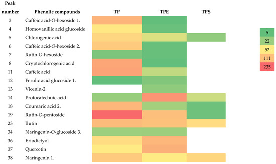 The main peaks that were annotated in the UV chromatograms of the raw material (pomace) and the final product (TPE) were compared. In addition, the same compounds found in these two types of extracts were compared with the TPS. The heatmap for semi-quantitative comparison of the main phenolic compounds identified is shown in the Figure 1.