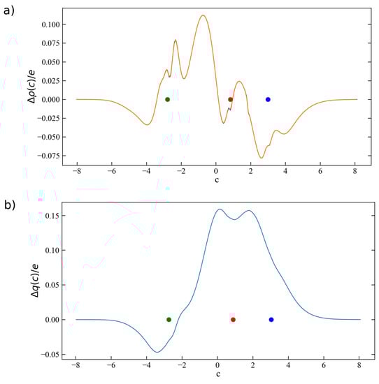 In panel (a), the charge–redistribution profile obtained by ordinary CD analysis (Equation (2)) is also shown as the orange curve. As evident, and are in very good agreement, with barely perceptible differences due to the fact that, while has been chosen to be equal to , the sampled points along the two paths c and z do not necessarily match and the two sets of points are in fact slightly shifted with respect to each other.