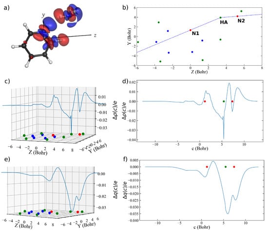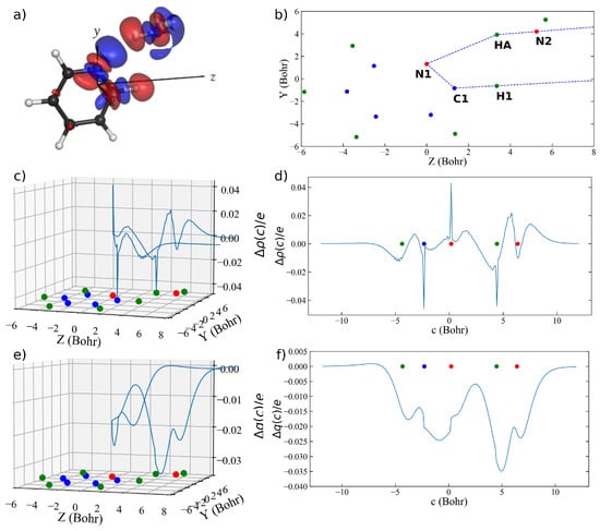 (a) for the pyridine–ammonia complex (isodensity surfaces at ±0.0005 e/bohr; red lobes: electron depletion; blue lobes: electron accumulation). (b) Curvilinear path c lying in the pyridine molecular plane. (c) represented on the pyridine molecular plane. (d) linearized as a function of the curvilinear coordinate c. (e) represented on the pyridine molecular plane. (f) linearized as a function of the curvilinear coordinate c. The position of the hydrogen, carbon, and nitrogen atoms are indicated with green, blue, and red dots on the molecular plane, respectively.