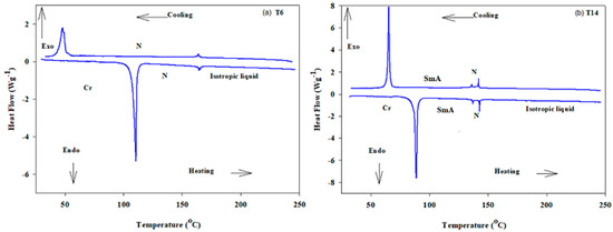 Representative examples of DSC thermograms for derivatives T6 and T14 via both heating and cooling rounds are illustrated in Figure 1. Designed compounds (Figure 1a,b) showed two or three endotherm peaks of transitions during the heating cycle and exothermic transitions during the cooling round, depending on the number and type of formed mesophases according to the corresponding length of the attached terminal alkoxy chain. The POM analysis revealed images which confirmed smectic A and N mesophases (Figure 2) depending on n. The N phase showed threads/a schlieren image and the SmA phase had a focal conic fan texture. The synthesized materials have enantiotropic behavior. Results of the mesomorphic transitions (temperatures, enthalpy and mesophase range) of all the investigated series (Tn), as measured from DSC analyses, are collected in Table 1. Moreover, the transition temperatures of all samples were graphically illustrated in Figure 3 in order to investigate the impact of terminal attached flexible chain length on the mesophase property of the series.