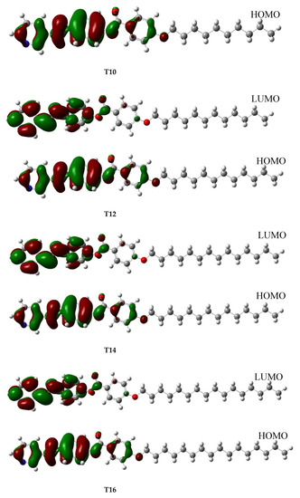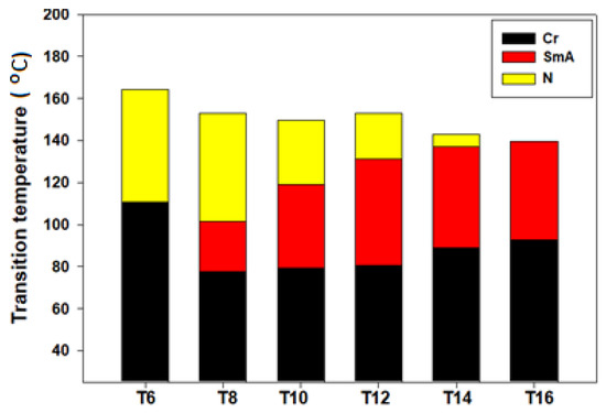 The results presented in Table 1 and Figure 3 revealed that the melting transitions have an irregular manner with the increasing number of carbons in the terminal chain (n = 6 to 16). Melting temperatures are related to the polarizability and molecular shape of the designed compounds [45]. Moreover, all the compounds of the group (Tn) are enantiotropic with a high good mesomorphic range and thermal stability. For the shortest chain derivative (T6), it has a monomorphic property exhibiting purely nematogenic phase. The N mesophase stability and range for T6 are 164.4 and 53.9 °C, respectively. By lengthening the terminal alkoxy chain from n = 6 to 8, the SmA starts to appear and the N phase stability decreases to 153.1 °C together with the N range, which descends to 51.5 °C for T8. Compounds T10, T12 and T14 are also found to be dimorphic, exhibiting SmA and N mesophases. The SmA range and stability increases with the increasing terminal length of flexible chain n from 8 to 14 carbons, but the reverse is the case for the N phase thermal stability and range (Table 1). The resultant phase becomes purely smectogeic in the compound with the longest chain in the series (T16). Data suggest that T16 derivative possesses only a monomorphic SmA mesophase with thermal stability and range of 139.5 and 46.6 °C, respectively. In general, the stability of the N phase decreases while the SmA phase increases with increasing terminal chain length [46,47]. The reduction trend in the N phase thermal transition may be due to the rigid mesogen dilution. Nevertheless, the production of SmA phase reduced the nematogenic range as the alkoxy chain length increases. This could be attributed to the increment of the van der Waals forces of attraction within the long terminal chains that facilitated the lamellar packing for the appearance of the smectic phase.