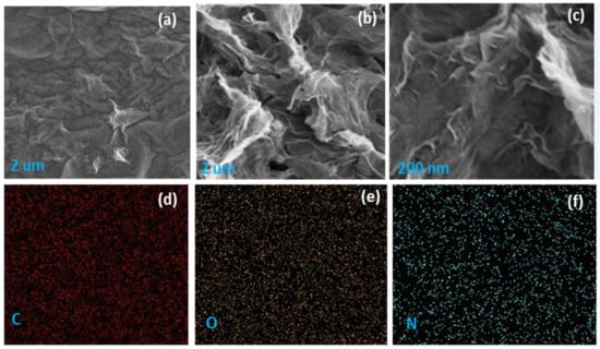 The field emission scanning electron microscopic (FESEM) images of GO and N-rGO and elemental mapping of N-rGO are shown in Figure 2. Several wrinkles and corrugation can be observed, possibly ascribed to oxygen-related functional groups and nitrogen dopant elements. Figure 2b shows that the wrinkles were more pronounced in N-rGO, indicating the effect of nitrogen doping on its morphology. Besides, Figure 2d–f present the element mapping of carbon, oxygen, and nitrogen of N-rGO, where homogeneous and regular dispersion of each element in the N-rGO sample was observed in a 2 µm2 selected area. FESEM analysis and EDX mapping revealed that nitrogen doping significantly affects the morphology and the homogeneous distribution of the elements, as shown in Figure 2d–f.
