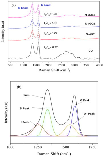 (a) Raman spectra of GO, N-rGO1, N-rGO2, and N-rGO3 and (b) deconvoluted Raman spectra of N-rGO3.
