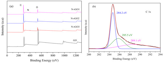Figure 5a illustrates the X-ray photoelectron spectroscopy (XPS) survey scan of GO and N-rGO. In the XPS spectra of N-rGO samples, O 1s, C 1s, and N 1s appeared at 285.3, 533.5, and 400.1 eV, respectively. When the XPS spectra of GO and N-rGO were compared, a substantial decrease in O 1s was observed in the N-rGO spectrum, which was ascribed to the reduction in graphene oxide. The Gaussian deconvolution of O 1s, C 1s, and N 1s of corresponding peaks was also performed to further analyze the existence of functionalized states in N-rGO samples, as shown in Figure 5b–d. Figure 5b illustrates the deconvoluted C 1s XPS spectra of N-rGO, where several peaks were observed, including C=C (284.2 eV), C–OH (285.5 eV), and C=O (289.1 eV), associated with chemical bonding of carbon–carbon and C-oxygen-related functional groups. A strong peak in C 1s spectra at 284.2 eV was observed and ascribed to the SP2 bonding of carbon atoms, which indicates the existence of the majority of carbon atoms in the honeycomb structure [34]. In O 1s deconvolution spectra (Figure 5c), the corresponding peaks at 531.2, 533.6, and 534.8 eV were ascribed to the O=C–OH, C–OH, and C–O functional groups, respectively [48]. Moreover, the N 1s spectrum was also convoluted into two peaks, 398.2 and 400.3 eV, as shown in Figure 5d, which corresponds to the existence of pyridinic and pyrrolic-N graphitic structures [15].